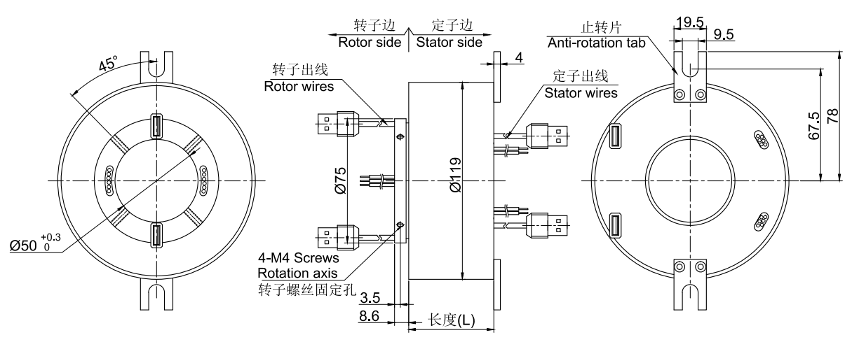 • · MUSB2502系列USB滑環(huán), 內(nèi)孔50mm, 外徑為標(biāo)準(zhǔn)119mm的緊湊型整體式結(jié)構(gòu)的2通道 USB1.0/USB2.0整體式精密導(dǎo)電滑環(huán),